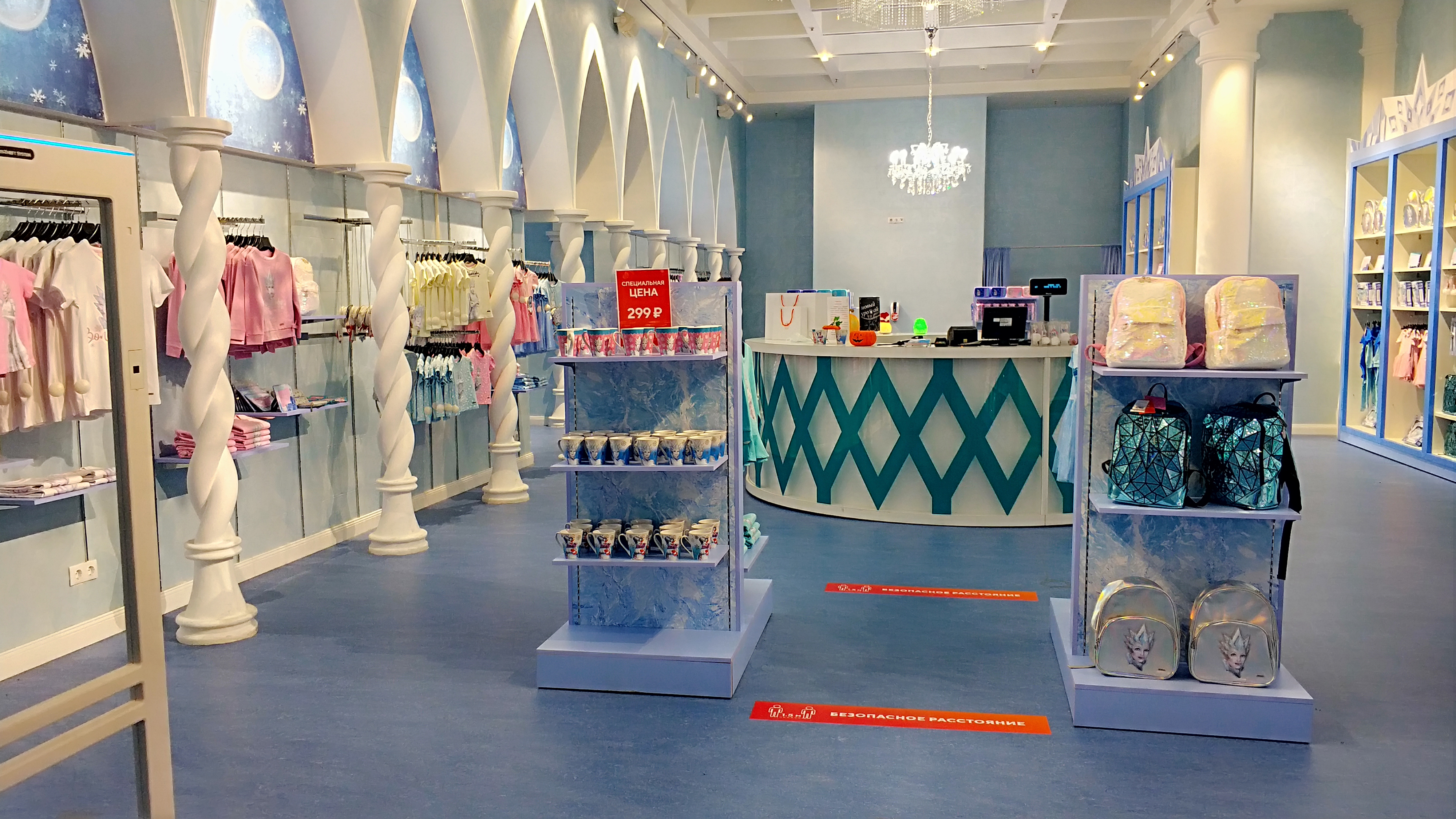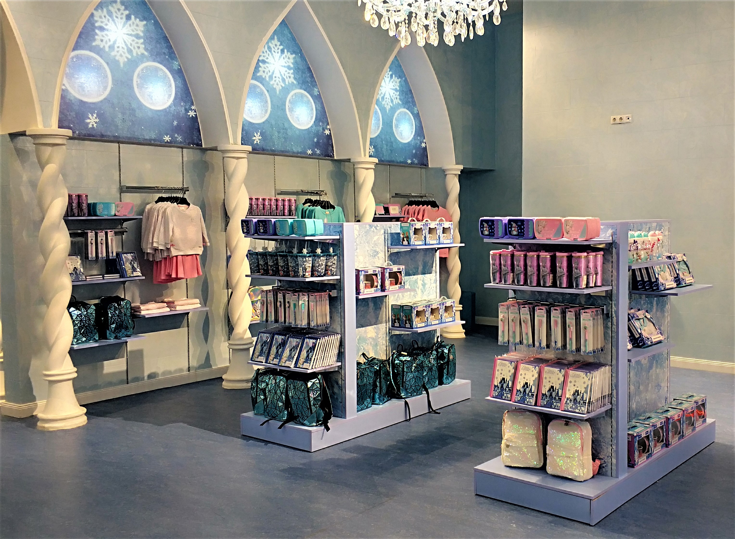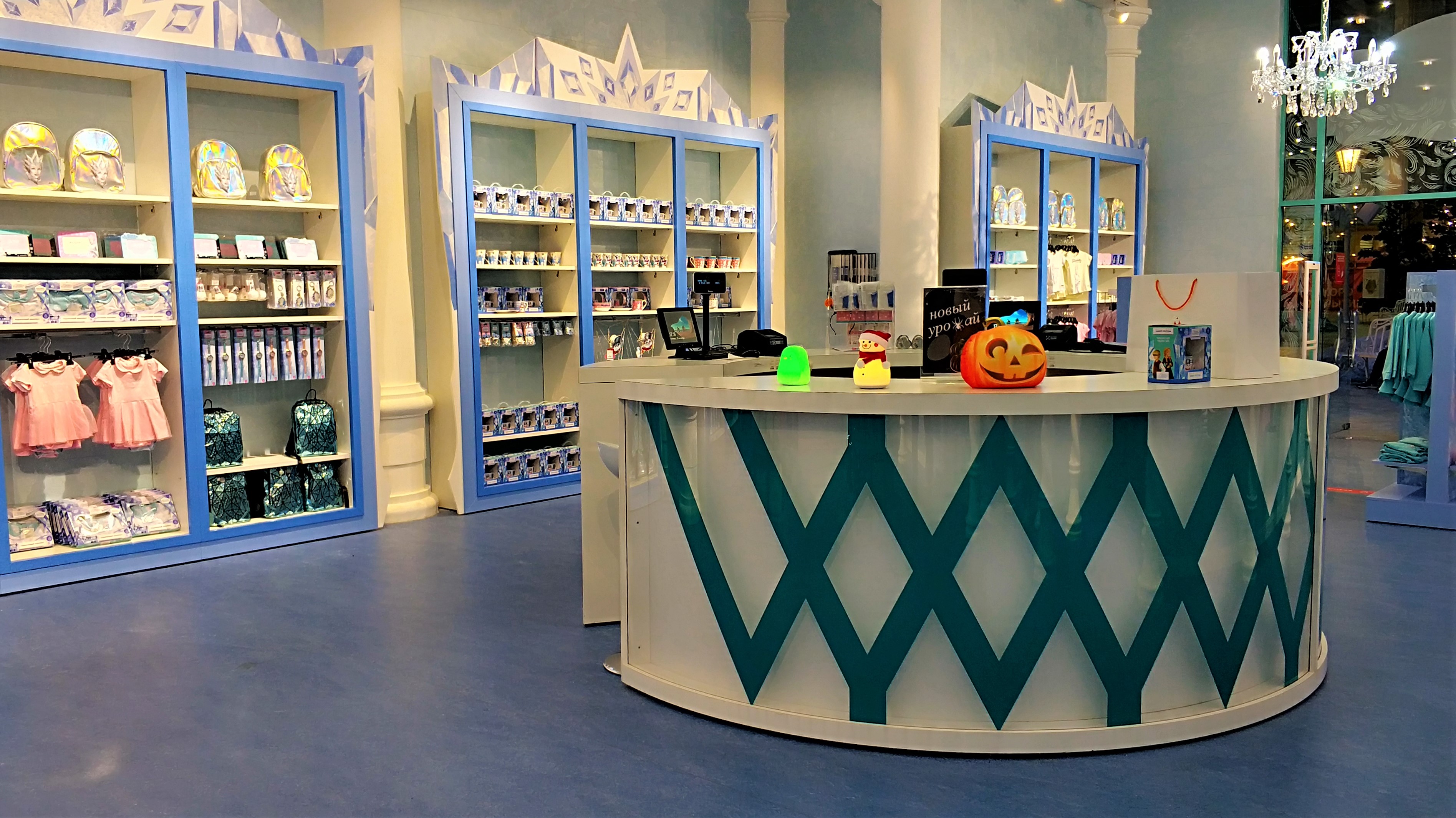 Замок Снежной Королевы в тематическом парке Остров Мечты имеет кроме аттракционов, ресторанов также магазин сувениров «Королевская шкатулка». Компания АУРА изготовила для этого магазина торговую мебель, шкафы, отдельно стоящие стойки и большую круглую cash-desk стойку.