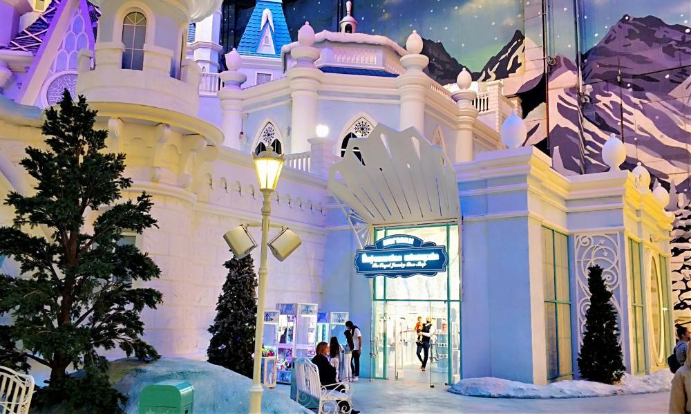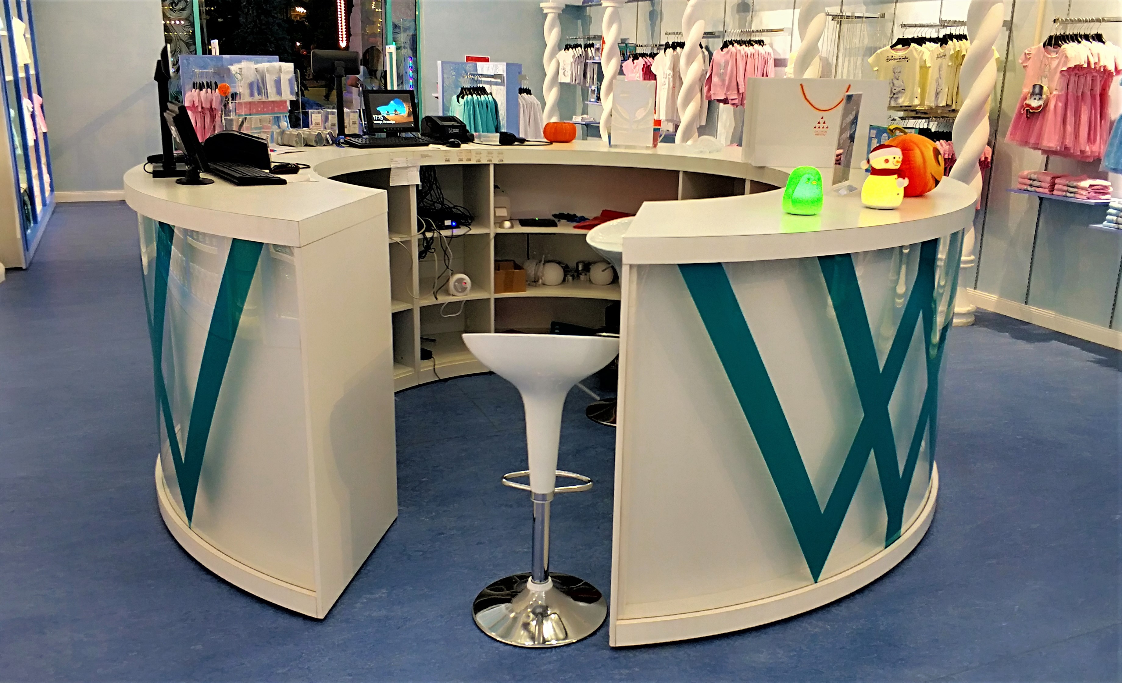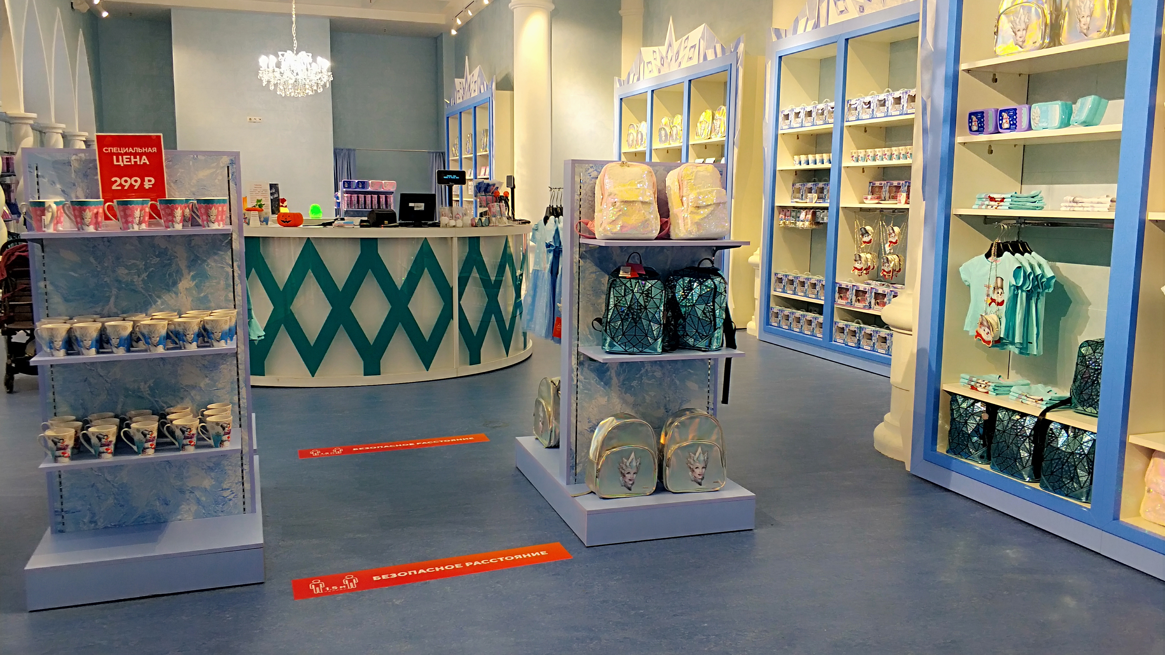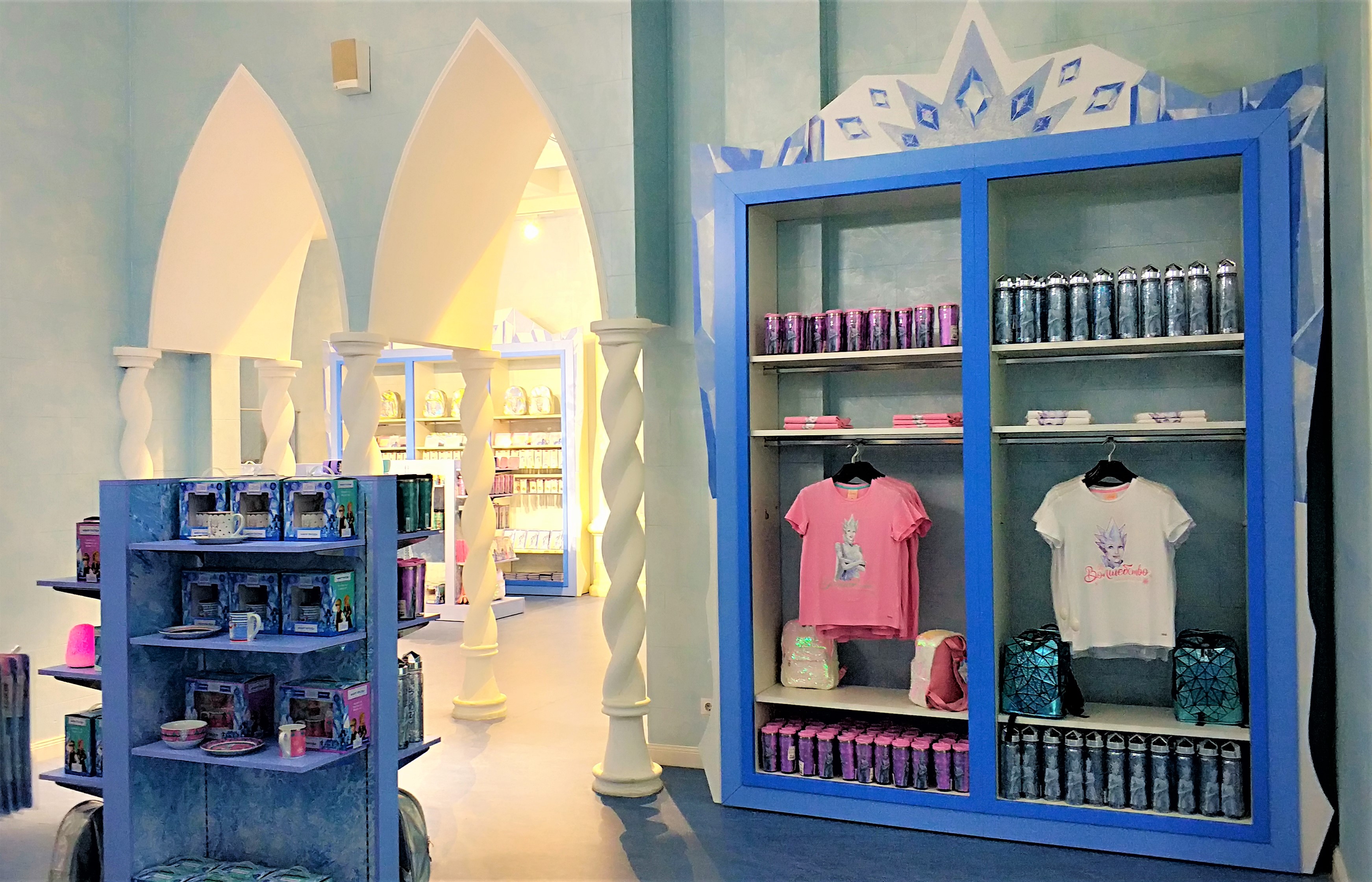 Замок Снежной Королевы в тематическом парке Остров Мечты имеет кроме аттракционов, ресторанов также магазин сувениров «Королевская шкатулка». Компания АУРА изготовила для этого магазина торговую мебель, шкафы, отдельно стоящие стойки и большую круглую cash-desk стойку.